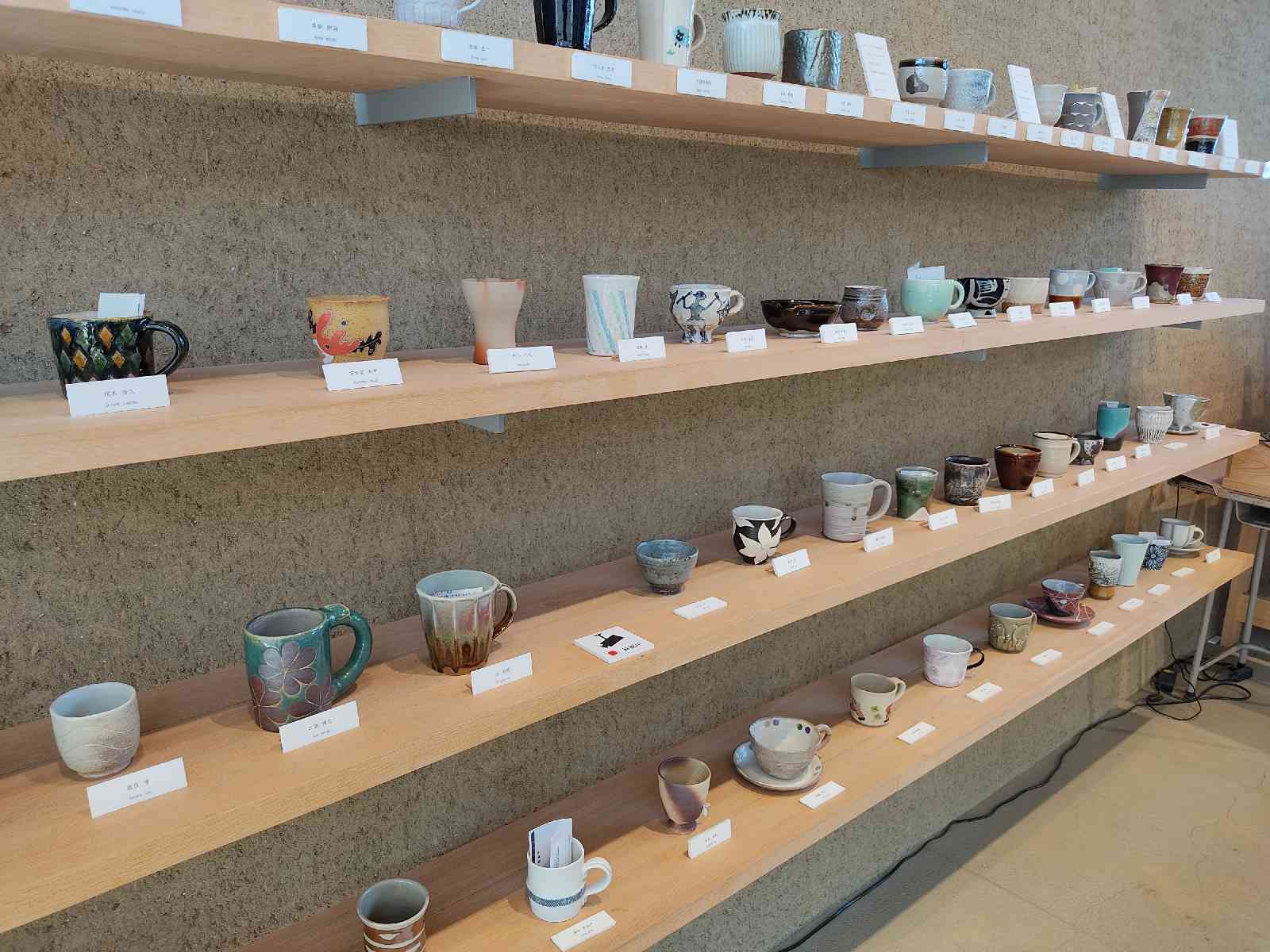 マーケットとホールでは益子焼きや絵本のキャラクターグッツが売られている。