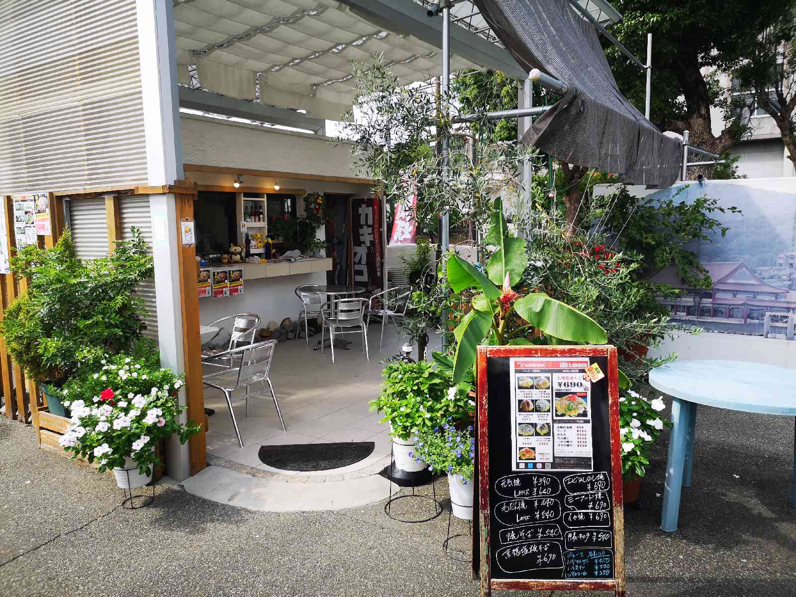 奥の建物『まねき』内のレストランは、牡蠣を中心とした海鮮メニューがいろいろ充実している