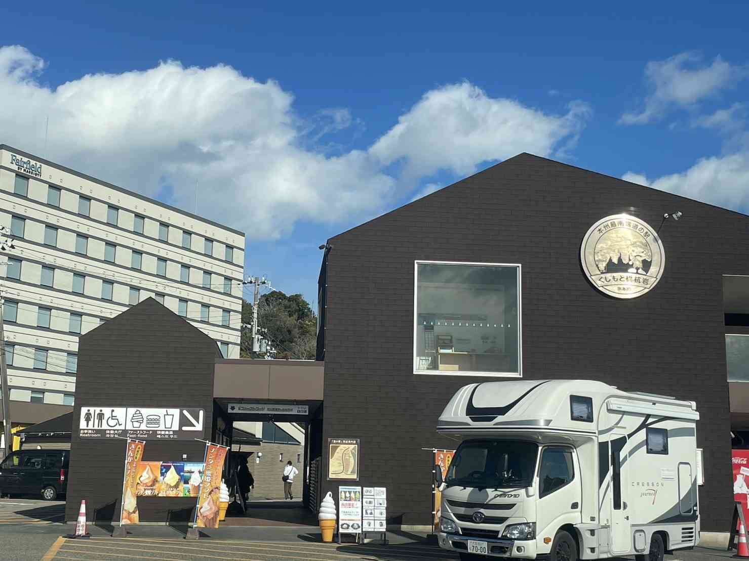 名勝、橋杭岩の横にあり、フードコートやお土産が充実。整備された道の駅です。